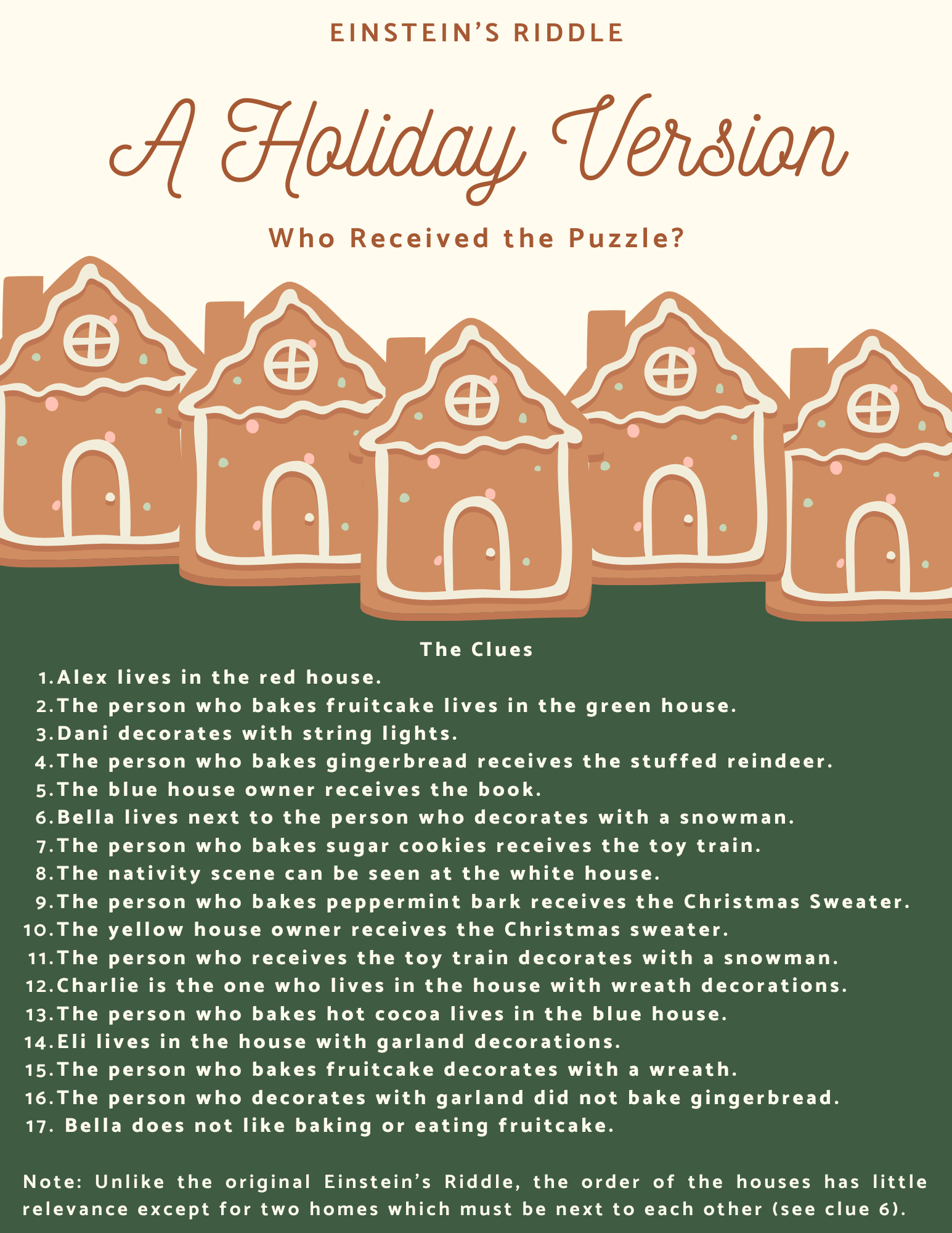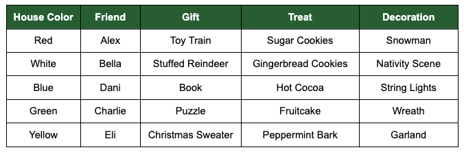 Inspired by Einstein's Riddle, here are all the clues and information for this holiday themed riddle: