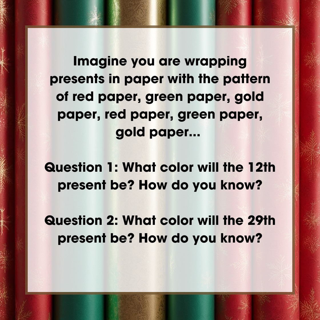 The days leading up to Christmas in the Christian tradition are known as the advent season. The word advent means "arrival" and it helps Christians to look towards and focus their hearts and minds on the arrival of Jesus. The themes to help us reflect on this time are: hope, peace, love and joy. While you may not celebrate Christmas, I wish you all a season of hope, peace, love and joy.... and some fun problem solving too!