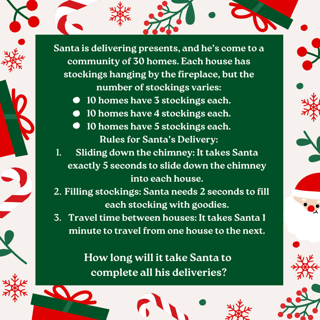 - Filling stockings: Santa needs 2 seconds to fill each stocking with goodies.