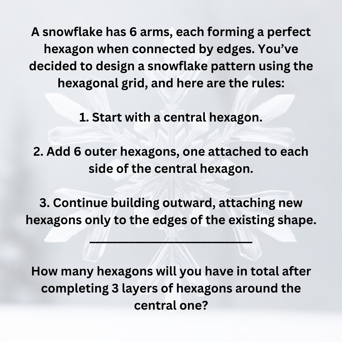 As an added challenge, if there were to be a missing number in the center of the snowflake, what would it be?